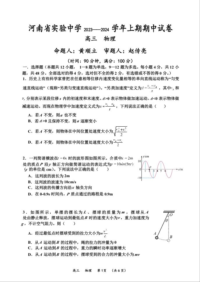 河南省实验中学2023-2024学年高三上学期期中考试 物理