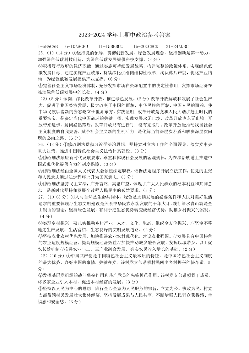 河南省实验中学2023-2024学年高三上学期期中考试 政治答案