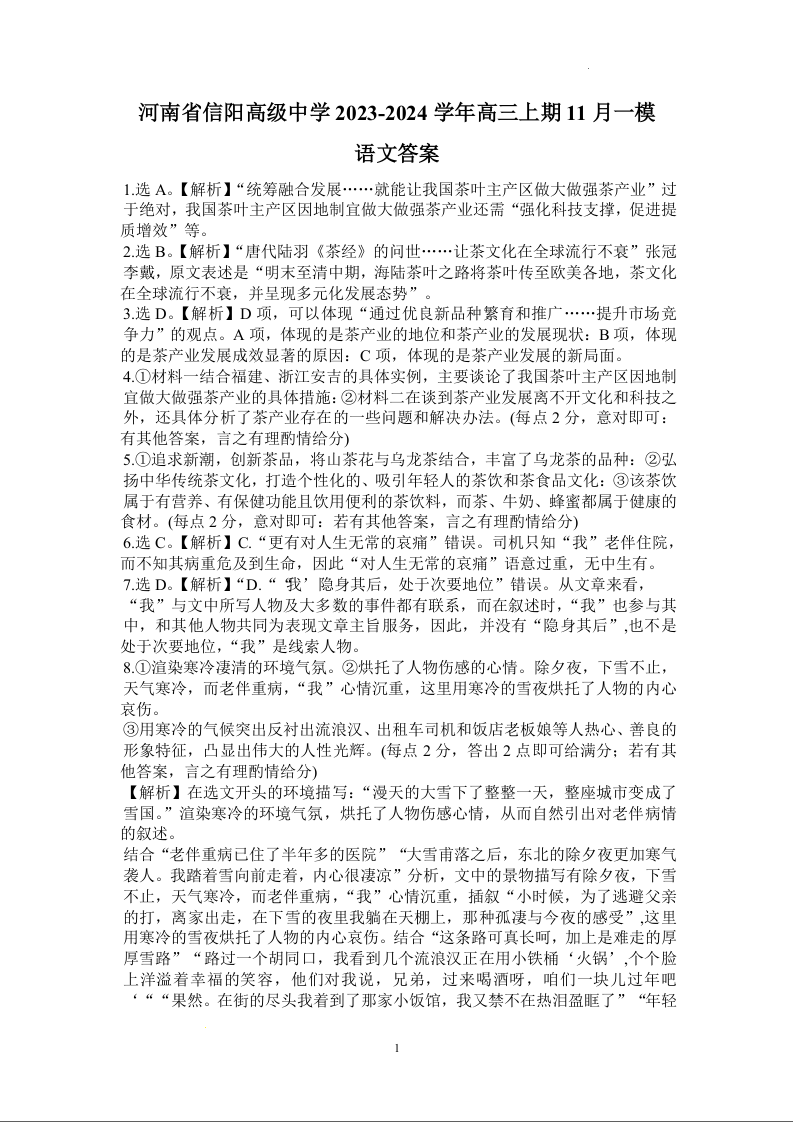 河南省信阳市信阳高级中学2023—2024学年高三上学期第一次模拟 语文答案