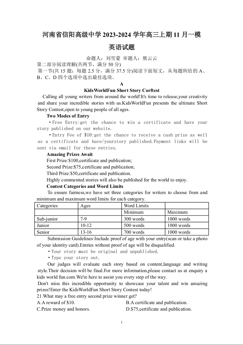 河南省信阳市信阳高级中学2023—2024学年高三上学期第一次模拟 英语