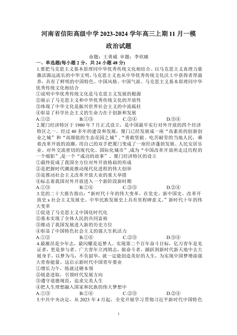 河南省信阳市信阳高级中学2023—2024学年高三上学期第一次模拟 政治