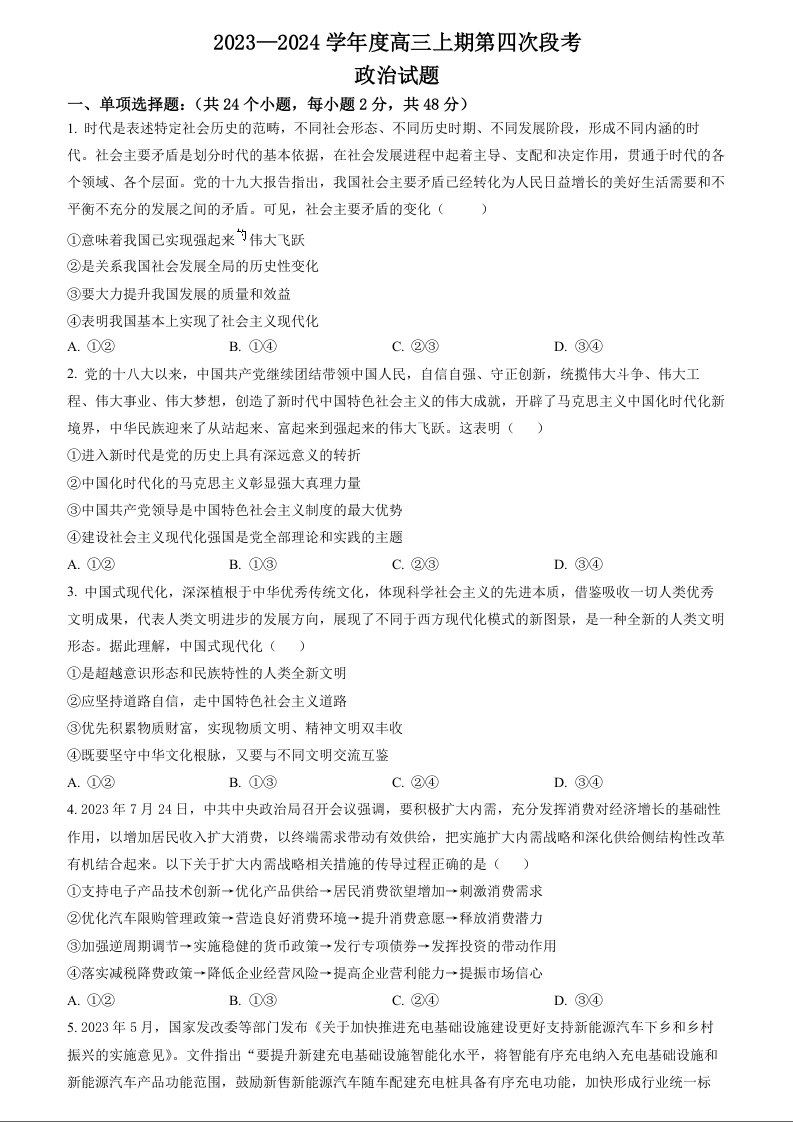 河南省周口市项城市第一高级中学2023-2024学年高三上学期11月期中考试 政治