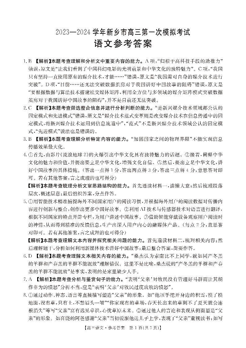 河南省新乡市2023-2024学年高三第一次模拟考试 语文答案