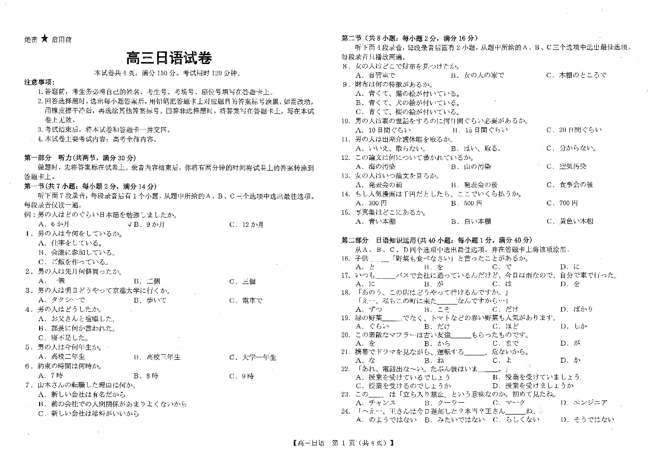 河南省新乡市2023-2024学年高三第一次模拟考试 日语