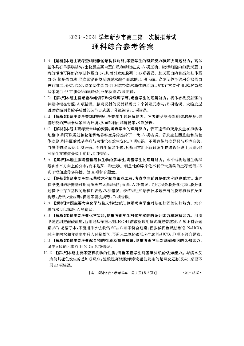 河南省新乡市2023-2024学年高三第一次模拟考试 理综答案