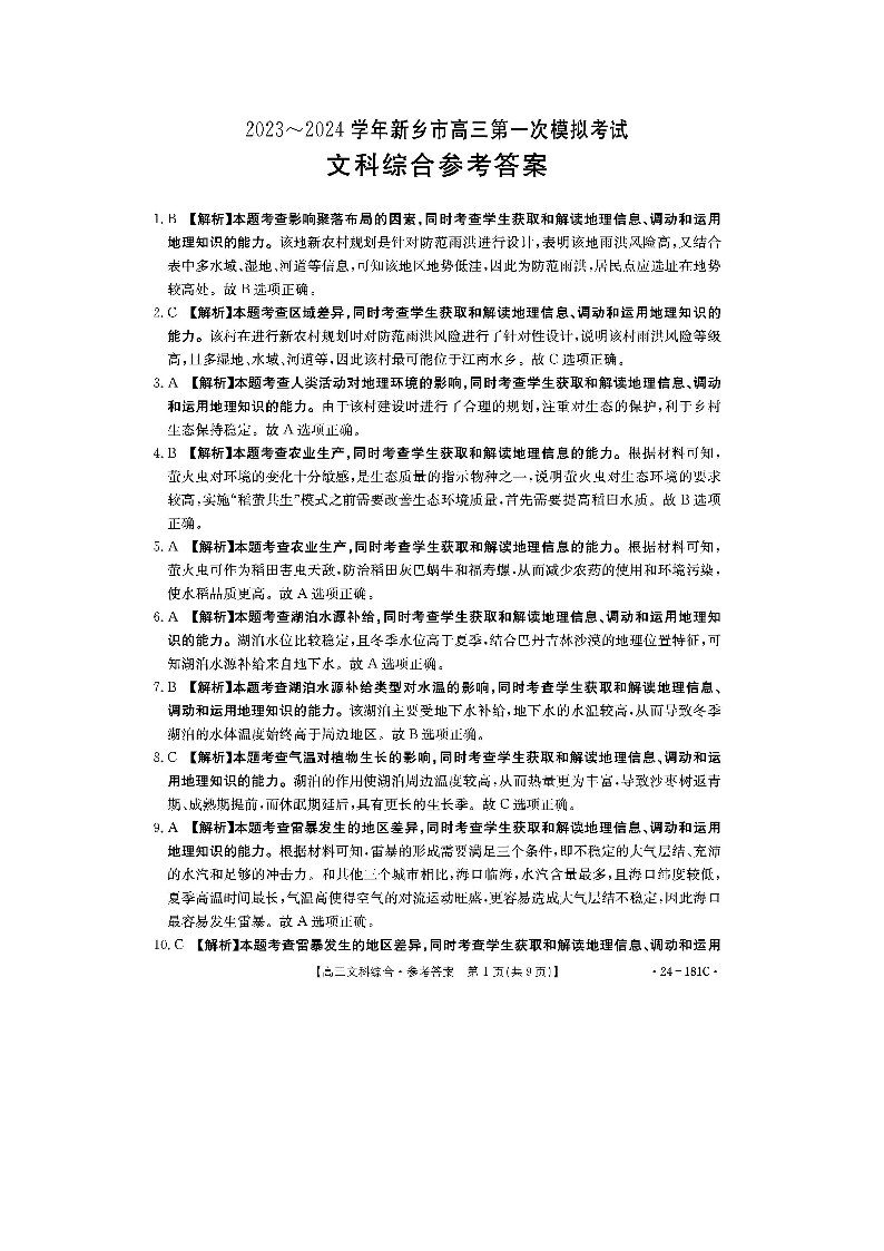 河南省新乡市2023-2024学年高三第一次模拟考试 文综答案