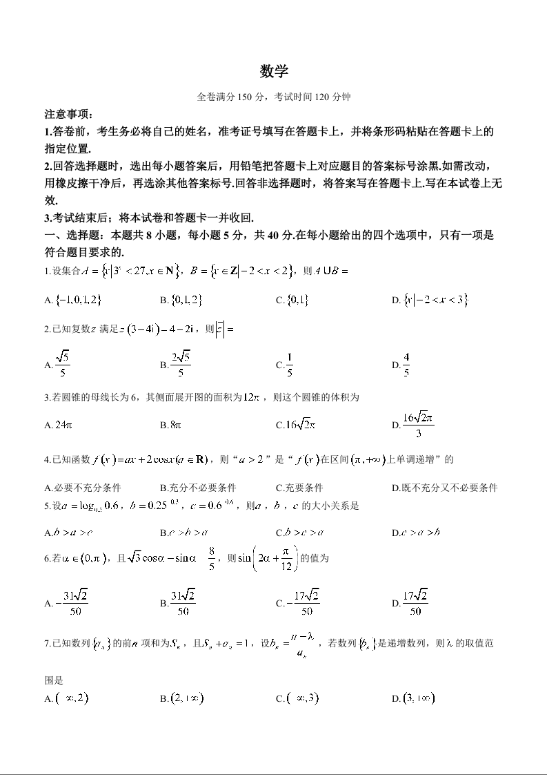 河南省新高中创新联盟TOP二十名校计划2023-2024学年高三上学期11月调研考试 数学