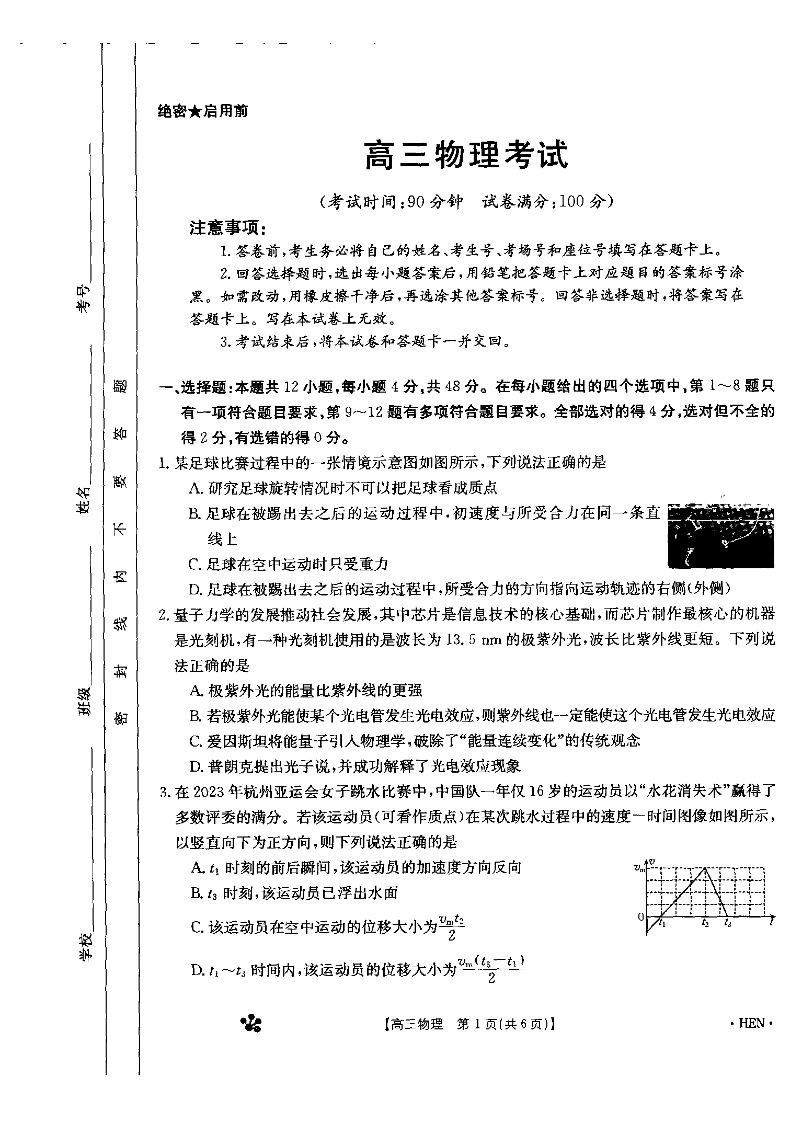 河南省部分重点中学2023-2024学年上学期高三11月大联考 物理