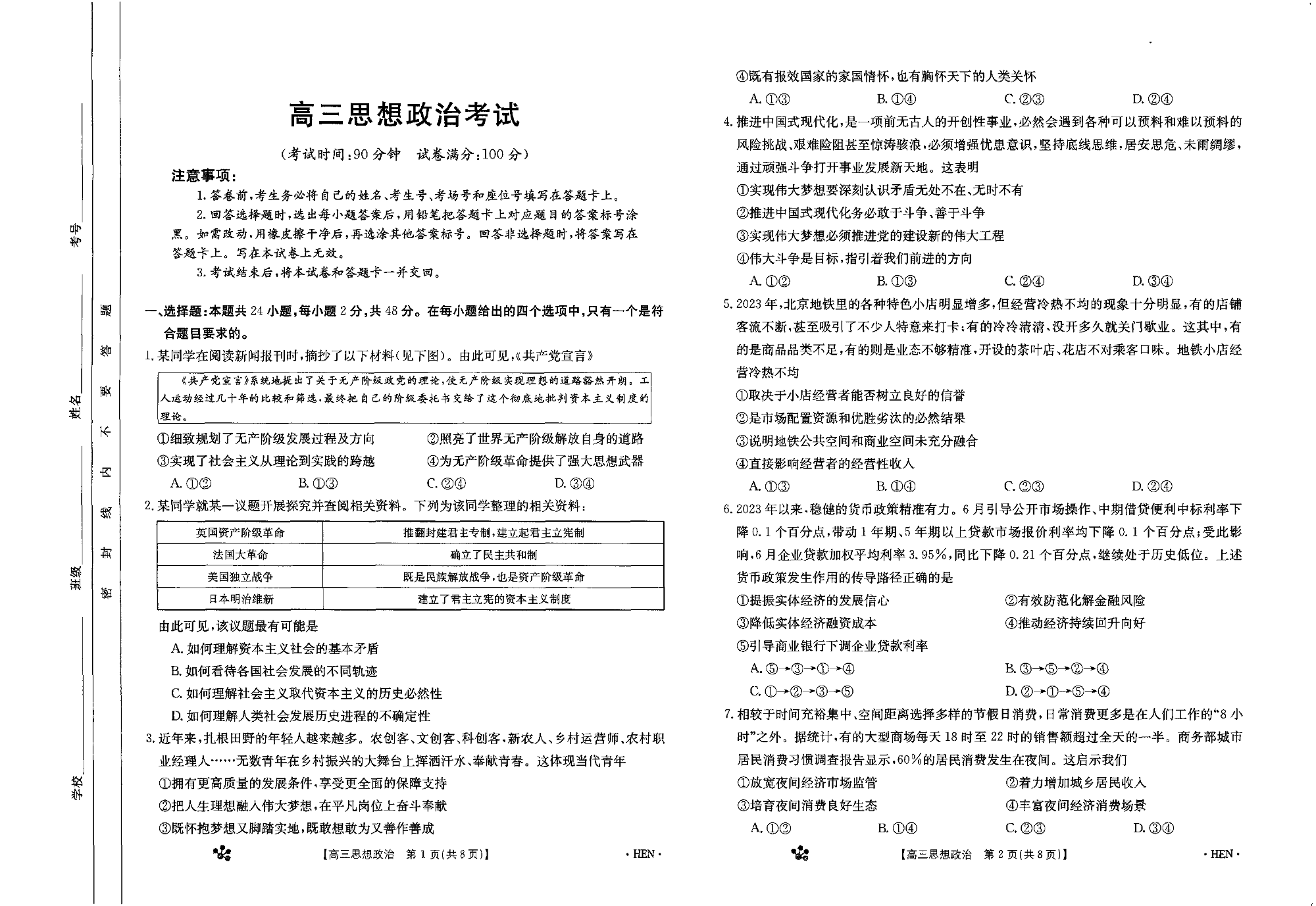 河南省部分重点中学2023-2024学年上学期高三11月大联考 政治