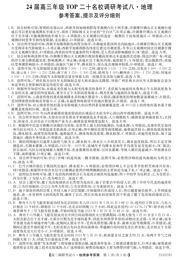 河南省TOP二十名校2023-2024学年高三上学期调研考试(八)地理答案