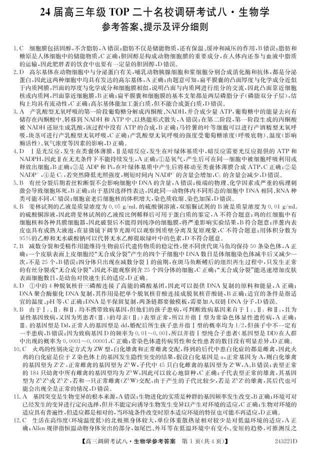 河南省TOP二十名校2023-2024学年高三上学期调研考试(八)生物答案