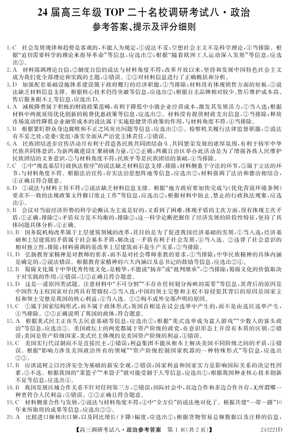 河南省TOP二十名校2023-2024学年高三上学期调研考试(八)政治答案