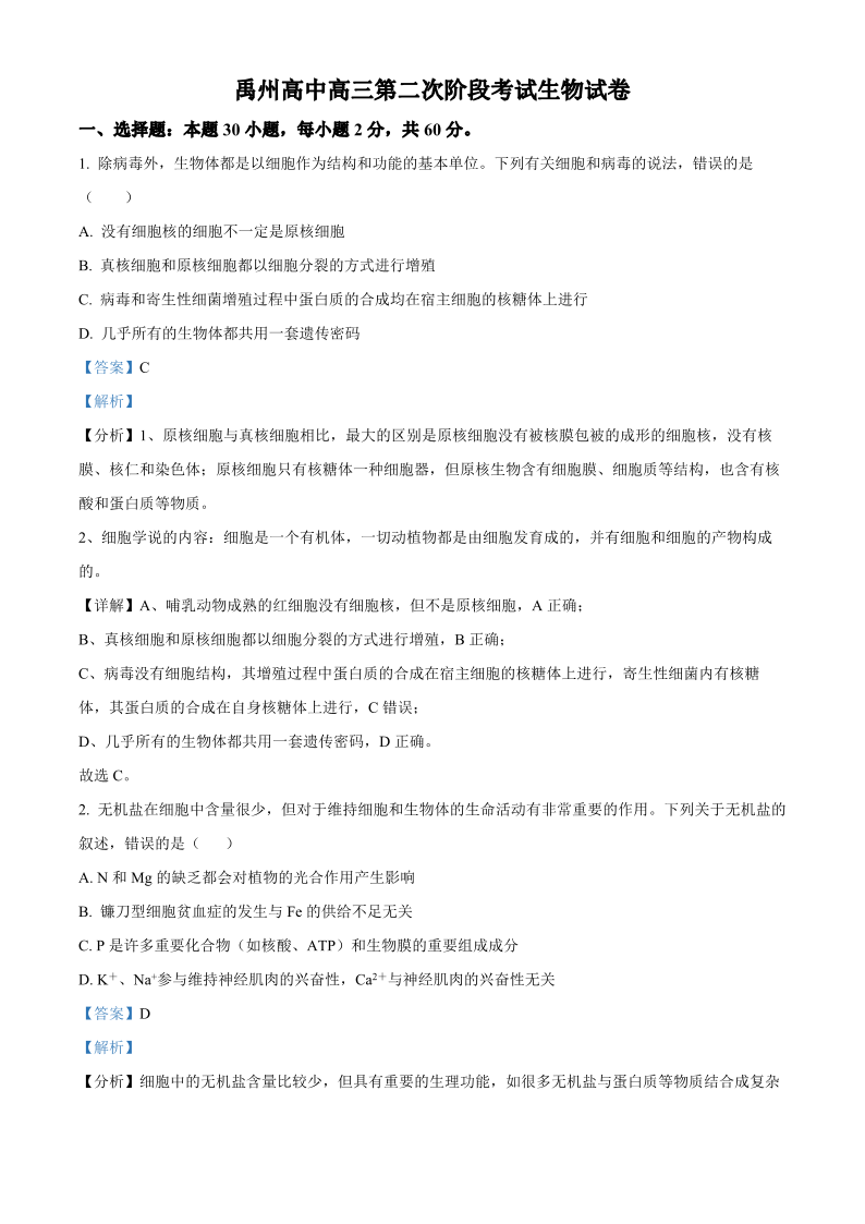河南省许昌市禹州市高级中学2024届高三上学期11月月考 生物答案