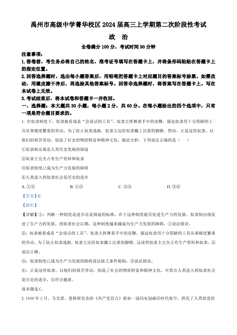 河南省许昌市禹州市高级中学2024届高三上学期11月月考 政治答案