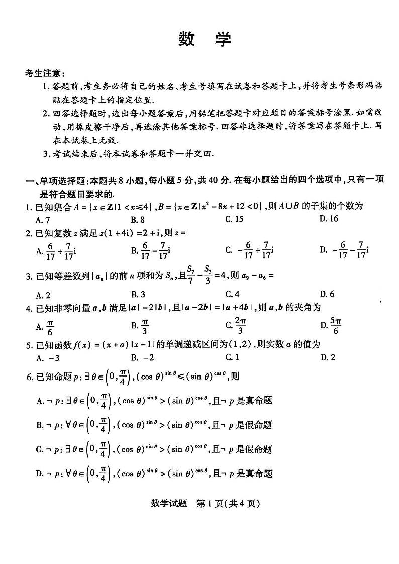 天一大联考·2023-2024学年高中毕业班阶段性测试(四)数学