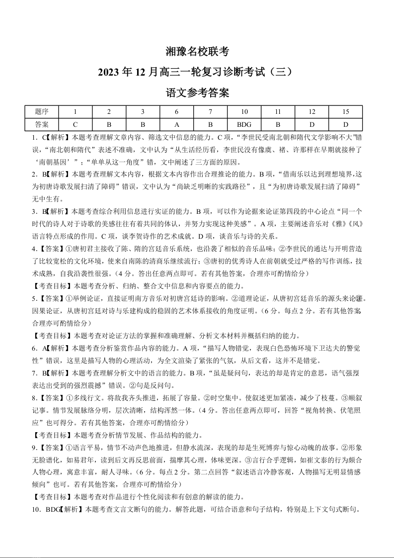 湘豫名校联考2023-2024学年12月高三一轮复习诊断考试(三)语文答案