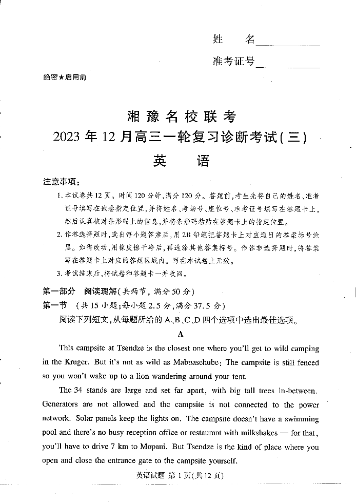 湘豫名校联考2023-2024学年12月高三一轮复习诊断考试(三)英语