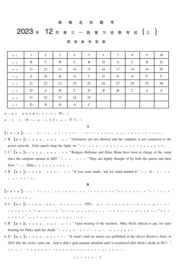 湘豫名校联考2023-2024学年12月高三一轮复习诊断考试(三)英语答案