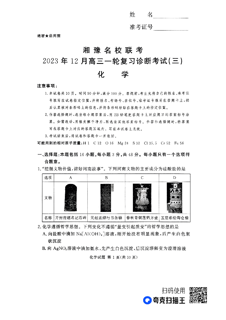 湘豫名校联考2023-2024学年12月高三一轮复习诊断考试(三)化学