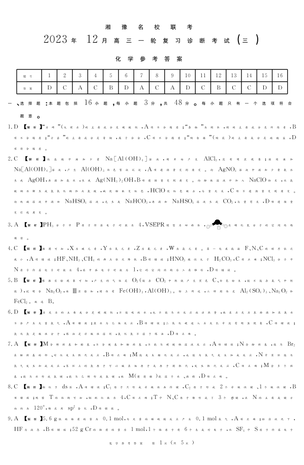 湘豫名校联考2023-2024学年12月高三一轮复习诊断考试(三)化学答案