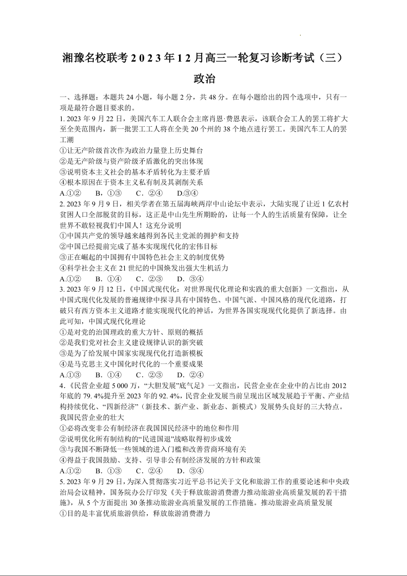 湘豫名校联考2023-2024学年12月高三一轮复习诊断考试(三)政治