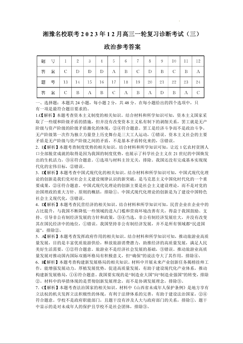 湘豫名校联考2023-2024学年12月高三一轮复习诊断考试(三)政治答案