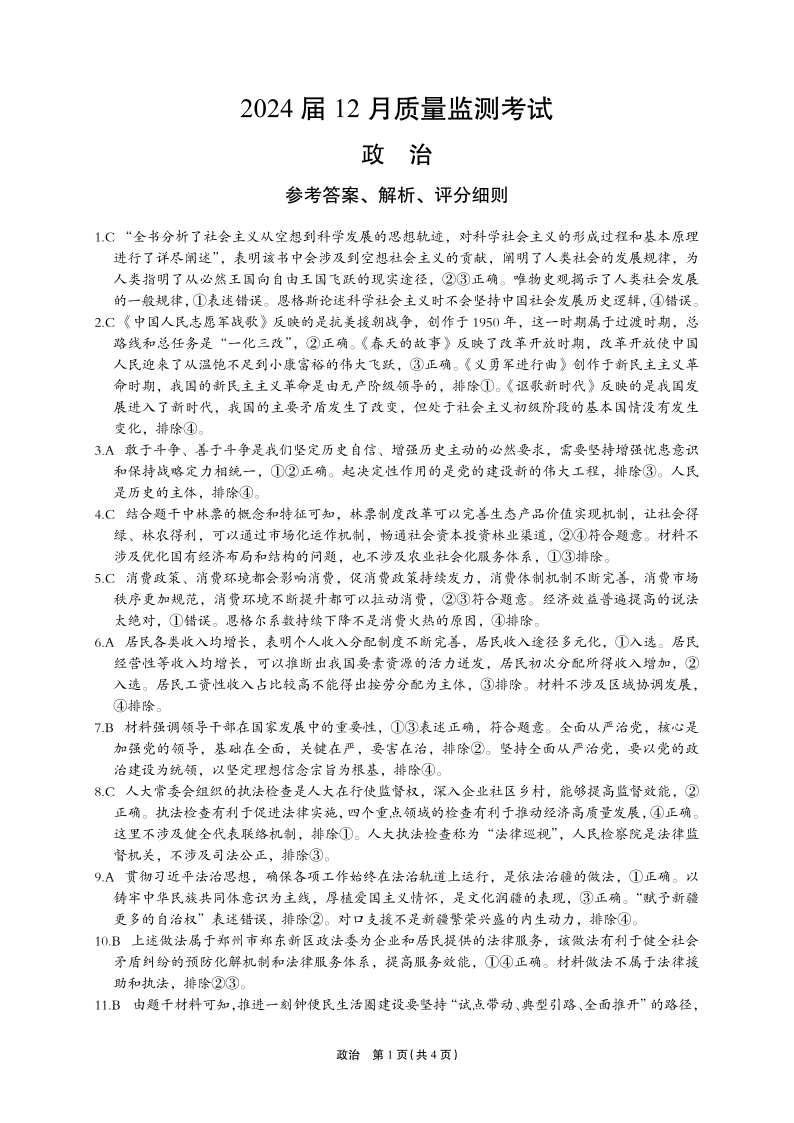 菁师联盟·河南省2023-2024学年高三上学期12月学情调研 政治答案
