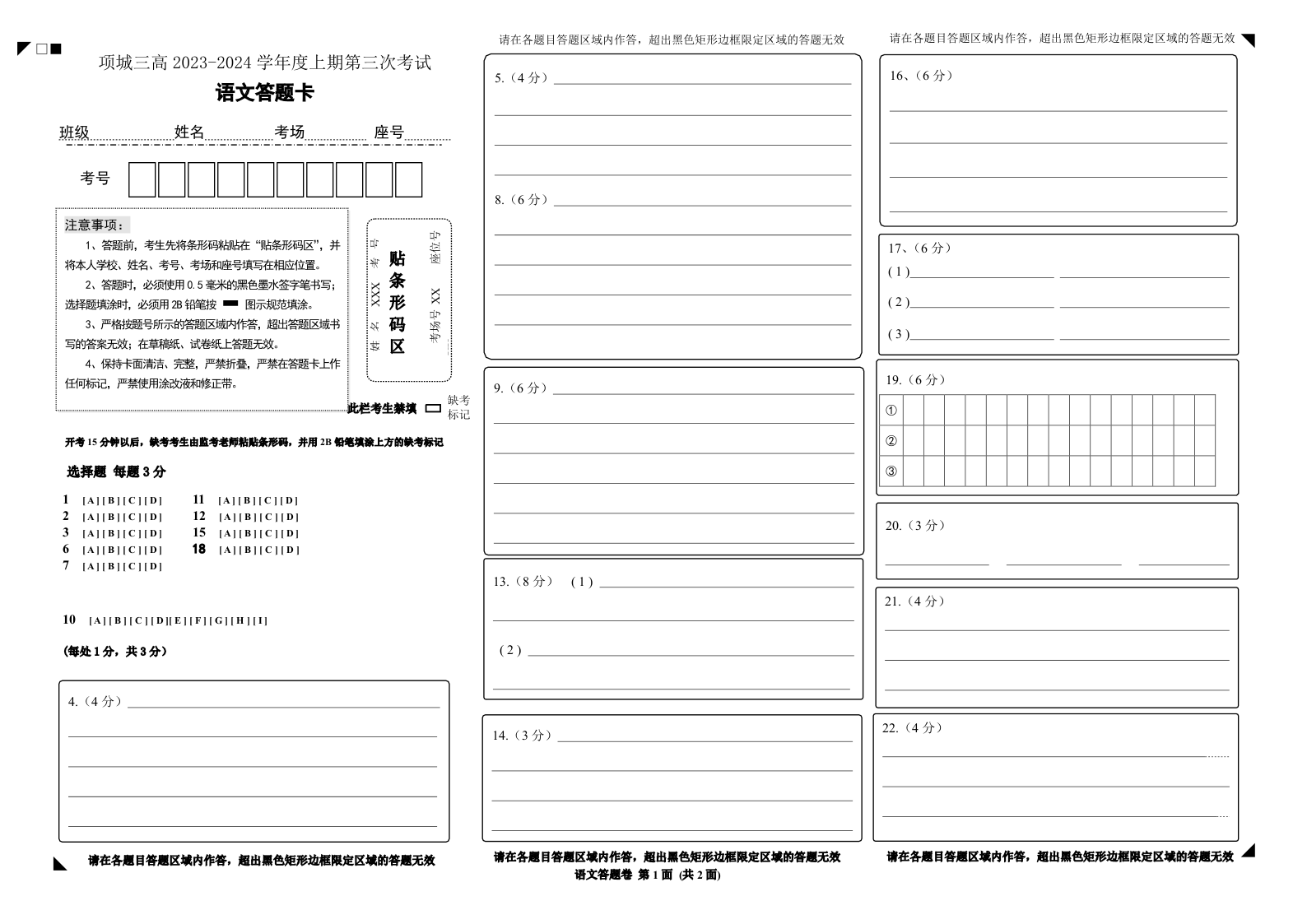 河南省周口市项城市第三高级中学2023-2024学年高三上学期第三次段考 语文答题卡
