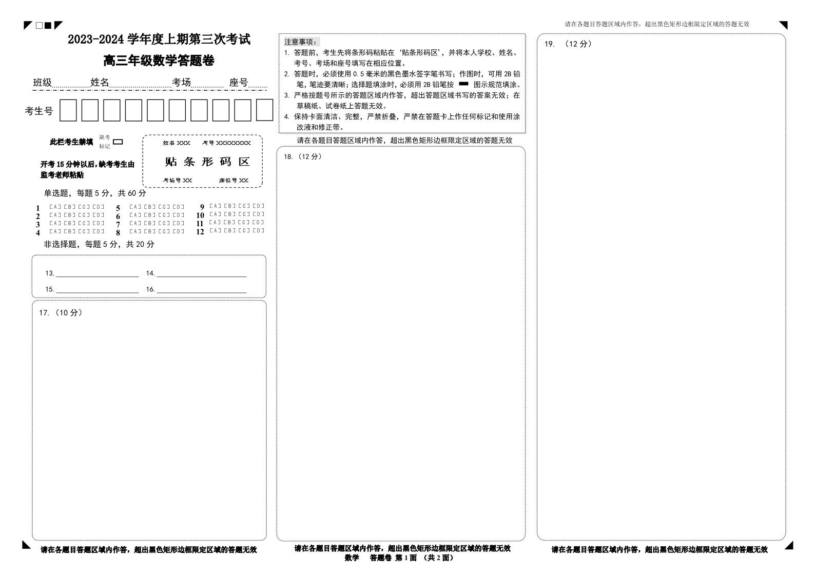 河南省周口市项城市第三高级中学2023-2024学年高三上学期第三次段考 数学答题卡