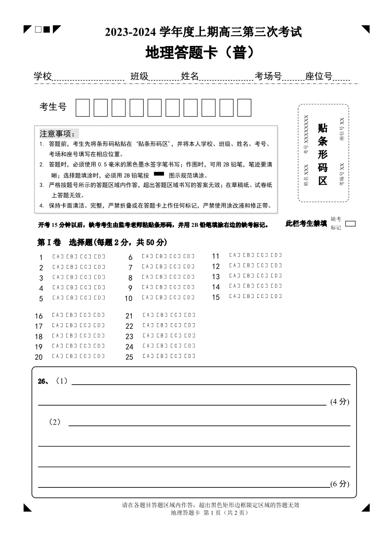 河南省周口市项城市第三高级中学2023-2024学年高三上学期第三次段考 地理答题卡