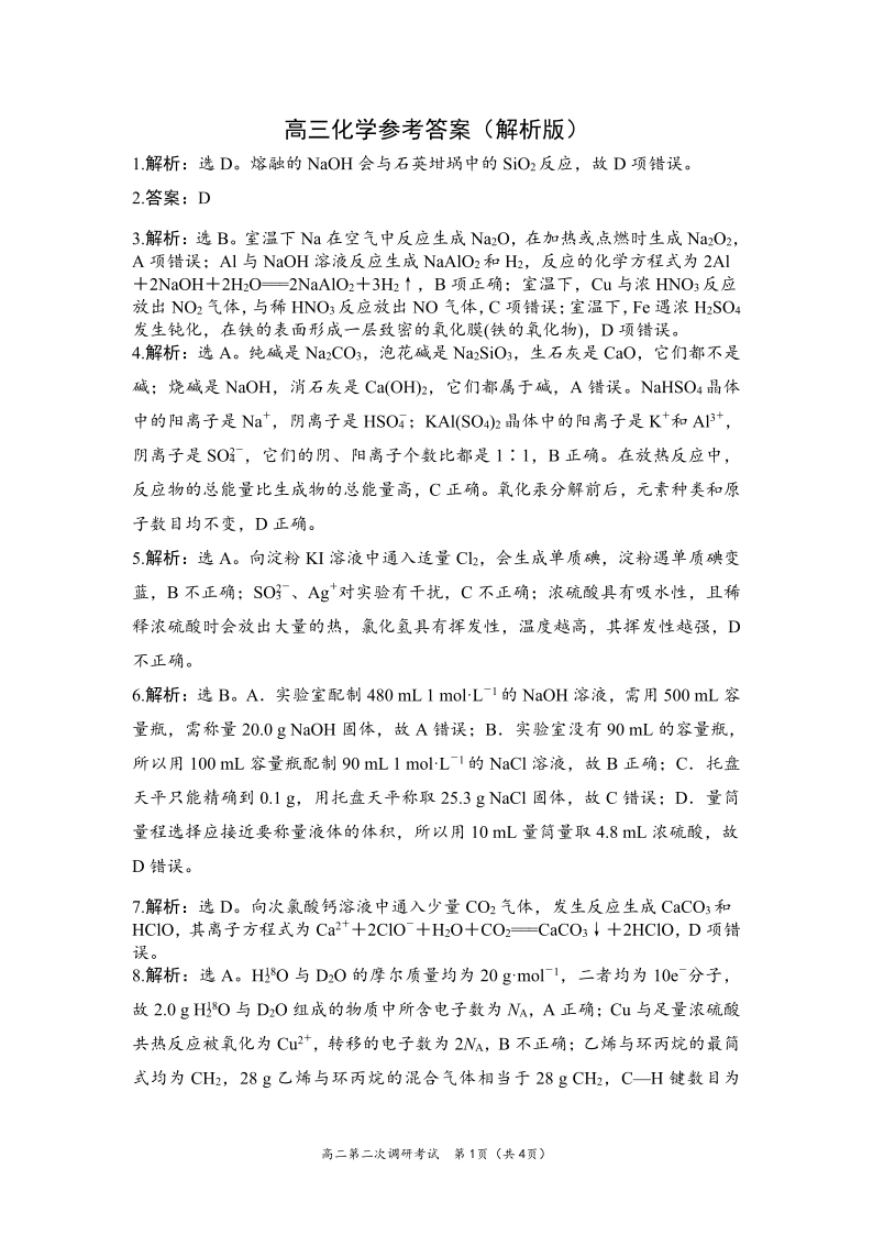 河南省周口市项城市第三高级中学2023-2024学年高三上学期第三次段考 化学答案