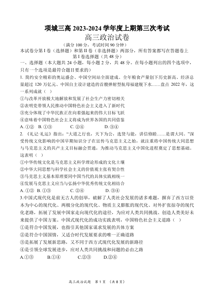 河南省周口市项城市第三高级中学2023-2024学年高三上学期第三次段考 政治