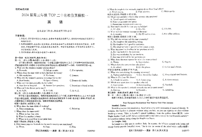2024届河南省TOP二十名校高三上学期仿真模拟(一)英语