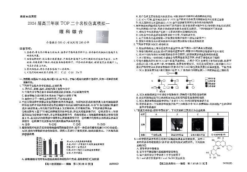 2024届河南省TOP二十名校高三上学期仿真模拟(一)理综