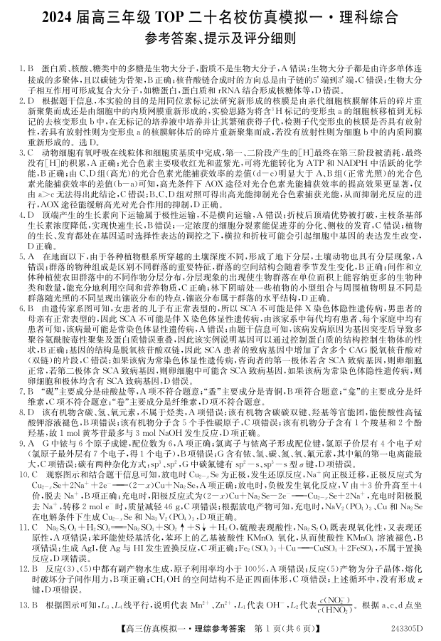 2024届河南省TOP二十名校高三上学期仿真模拟(一)理综答案
