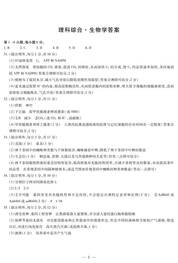 天一大联考顶尖联盟2024届高三阶段性测试(二)理综生物简易答案