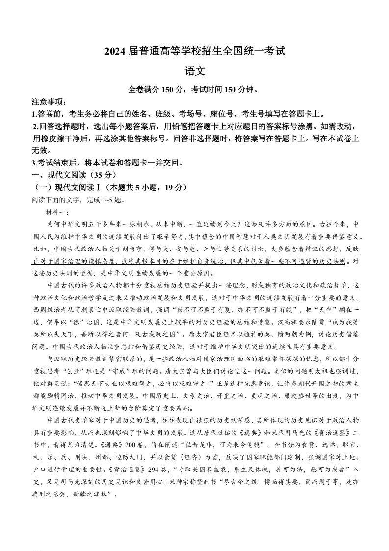 2024届普通高等学校招生全国统一考试青桐鸣大联考 语文
