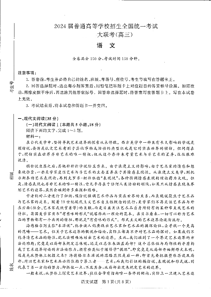 河南省中原名校2023-2024学年高三下学期3月联考 语文