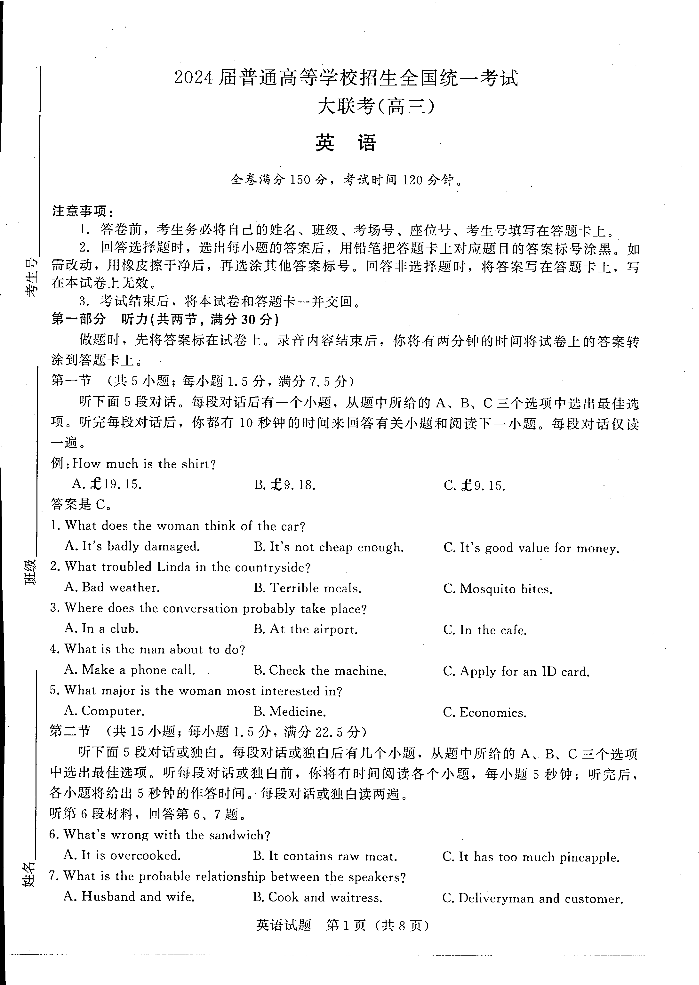 河南省中原名校2023-2024学年高三下学期3月联考 英语
