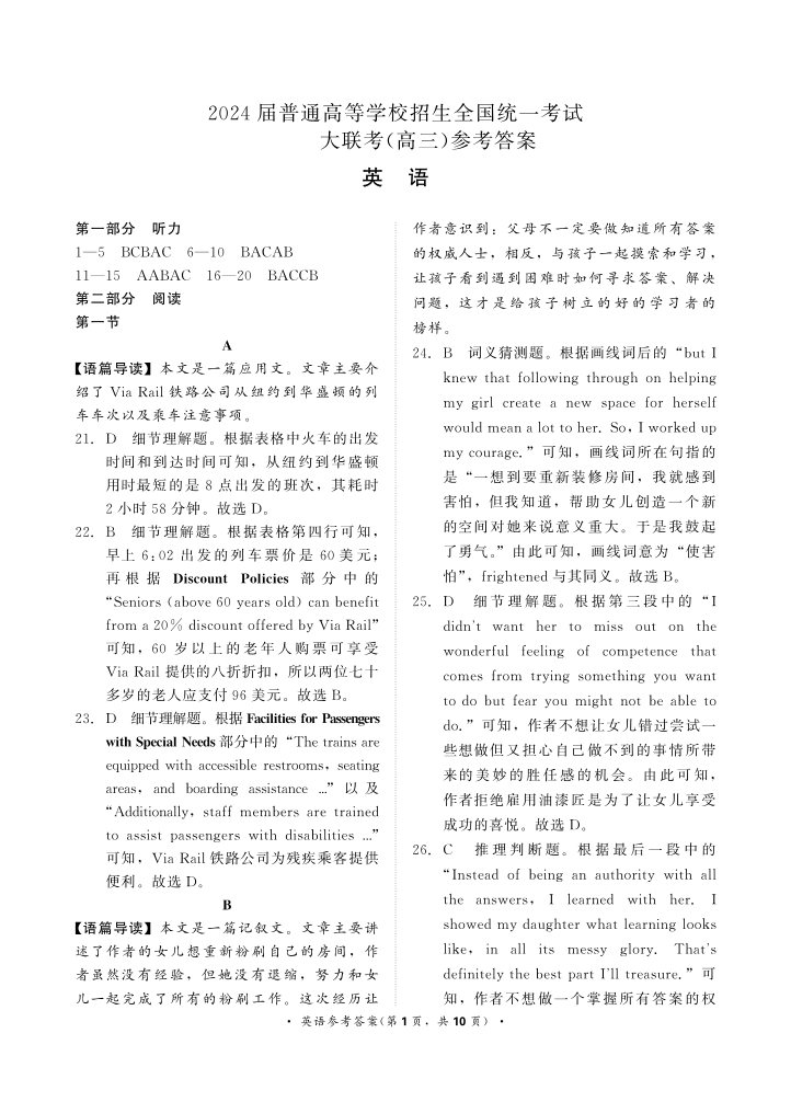 河南省中原名校2023-2024学年高三下学期3月联考 英语答案