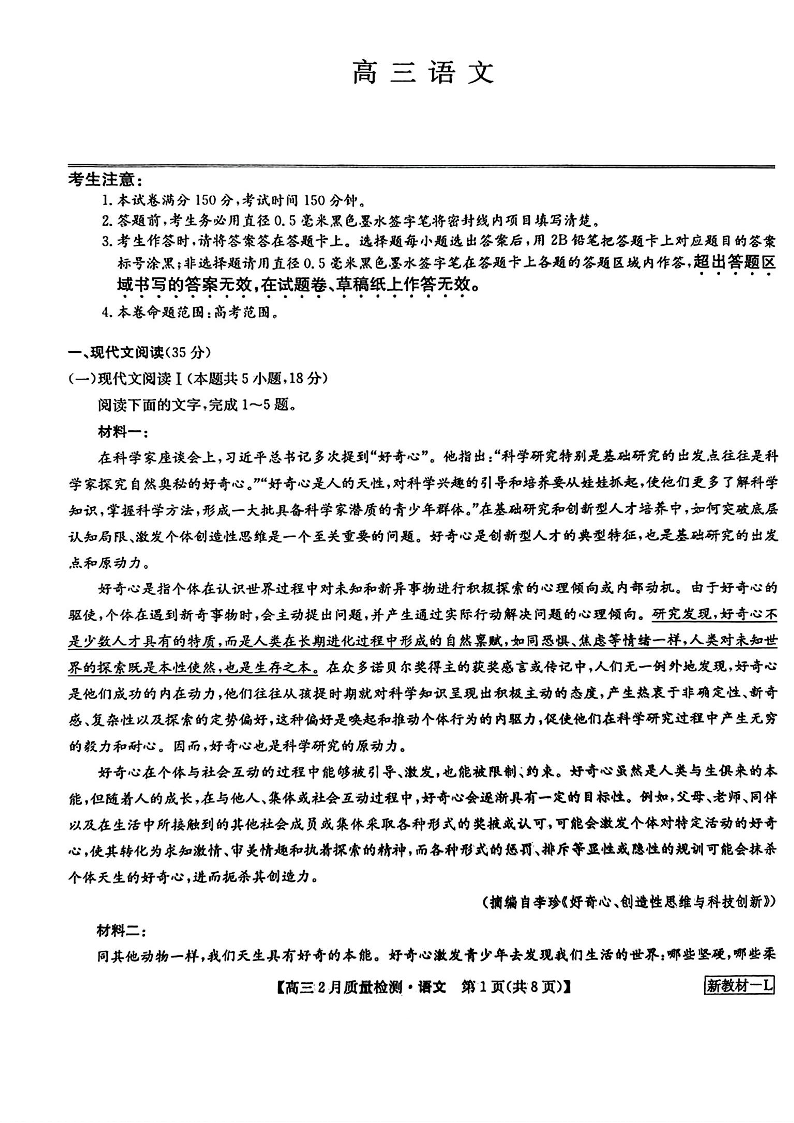 九师联盟2023-2024学年高三下学期2月质量检测 语文