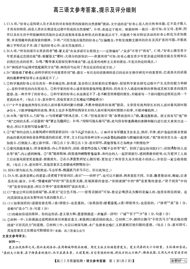高三语文参考答案提示及评分细则