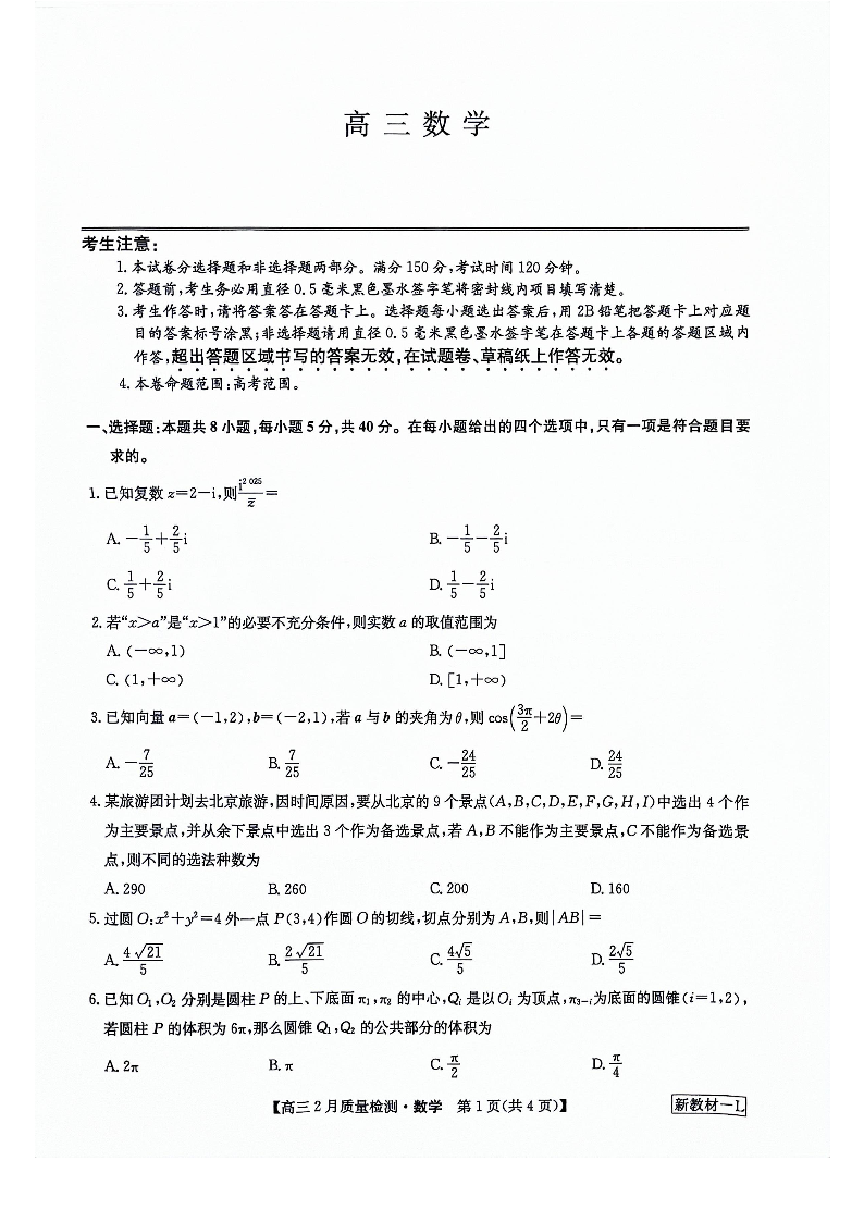 九师联盟2023-2024学年高三下学期2月质量检测 数学