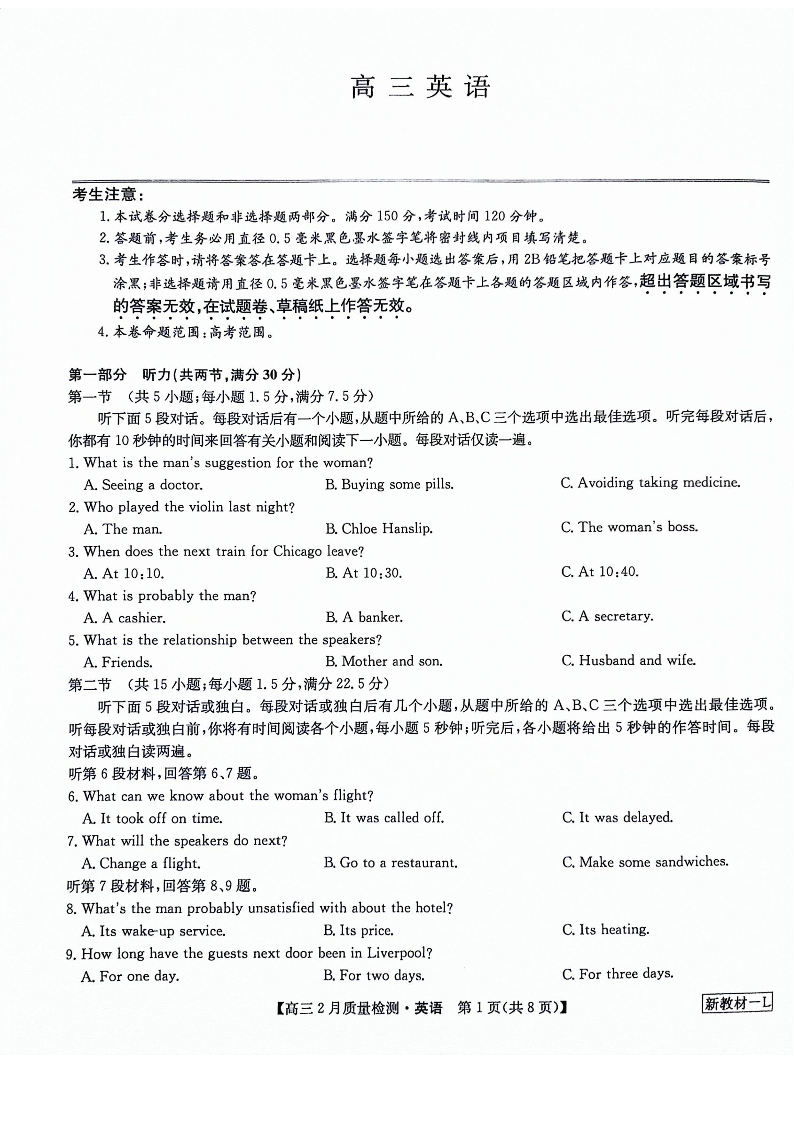 九师联盟2023-2024学年高三下学期2月质量检测 英语