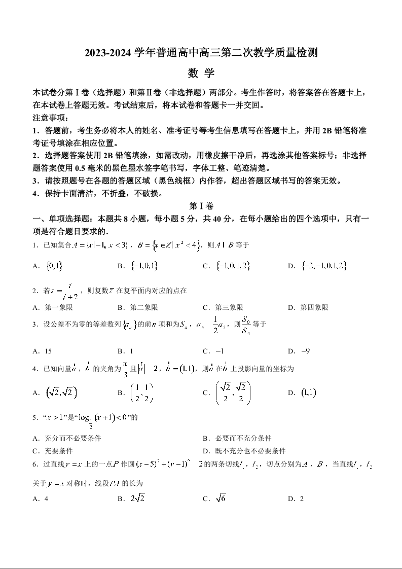 河南省信阳市2023-2024学年高三上学期第二次教学质量检测试题 数学