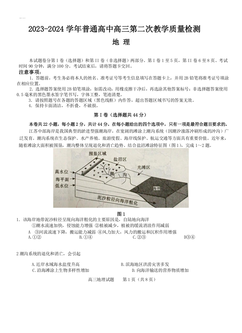 河南省信阳市2023-2024学年高三上学期第二次教学质量检测试题 地理