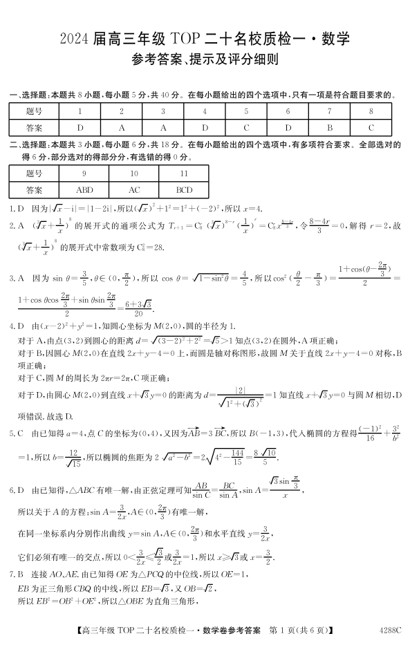2024届河南省TOP二十名校高三年级下学期质检(一)数学答案