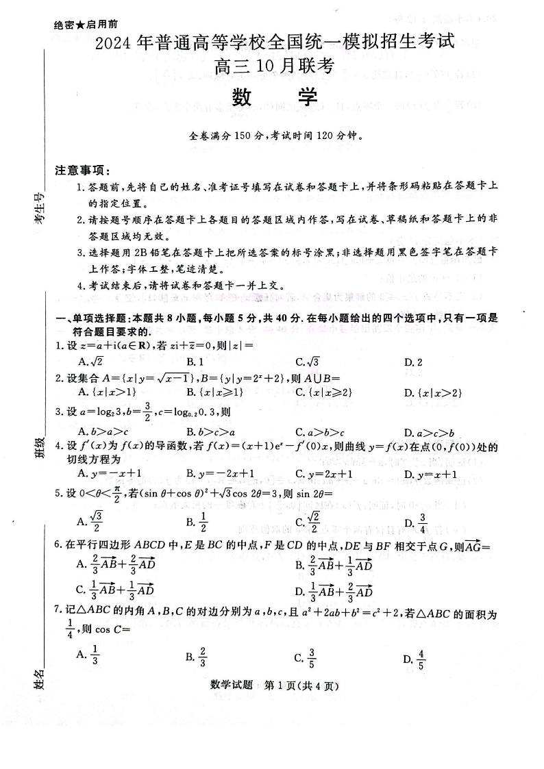 河南省新未来联考2023-2024学年高三上学期10月联考 数学
