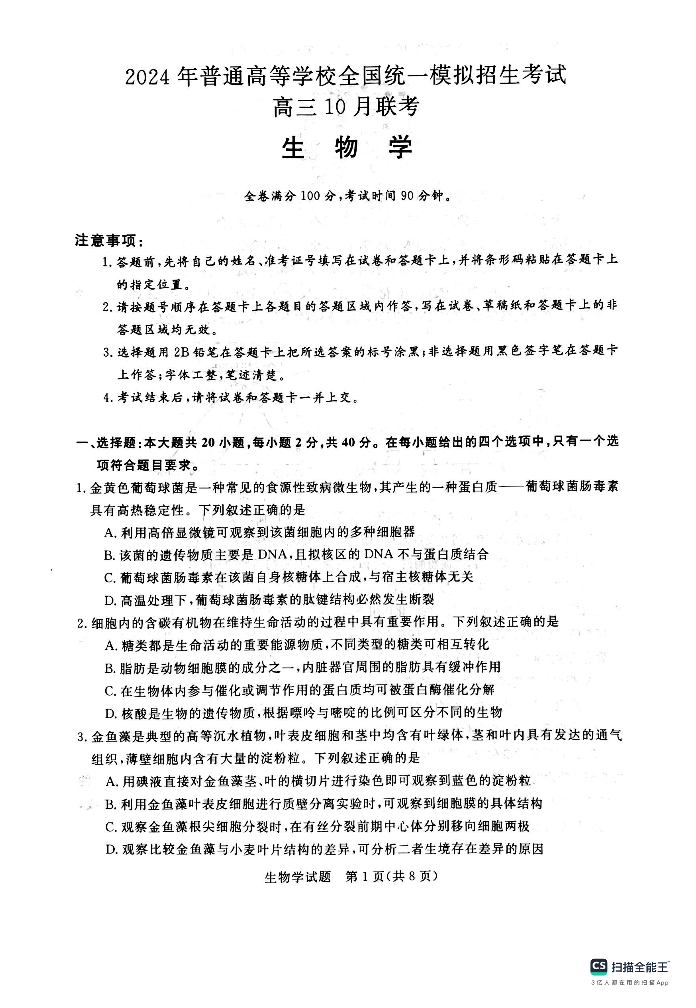 河南省新未来联考2023-2024学年高三上学期10月联考 生物