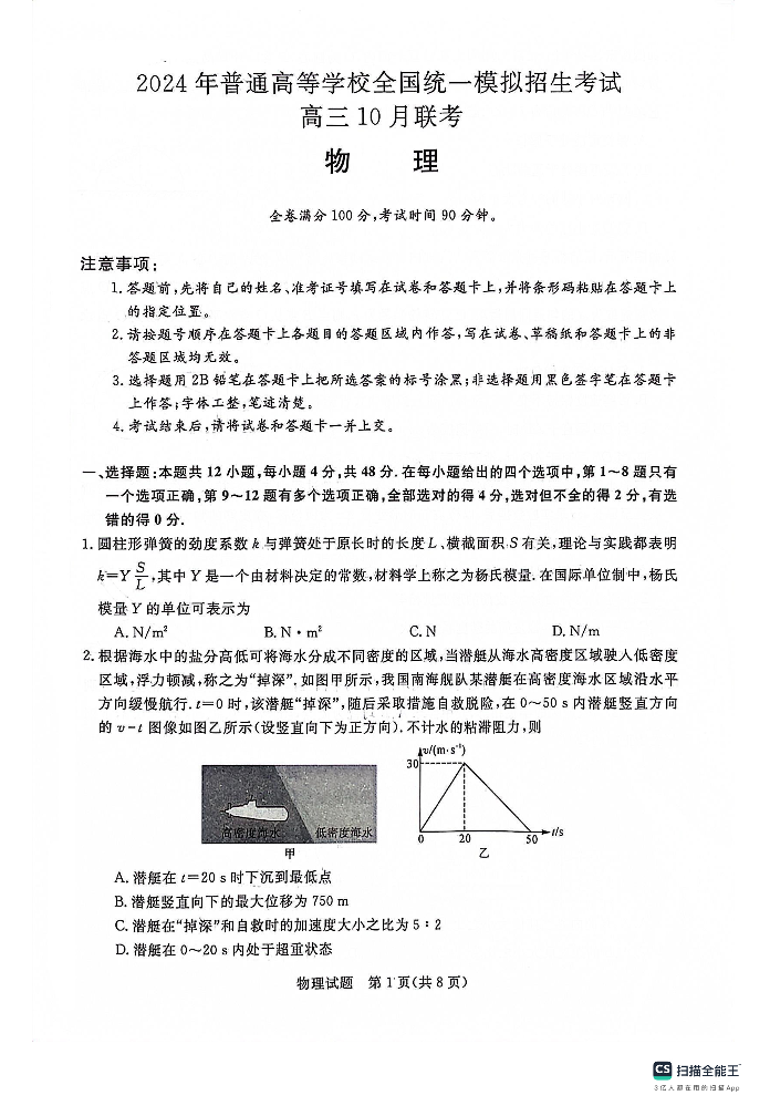 河南省新未来联考2023-2024学年高三上学期10月联考 物理
